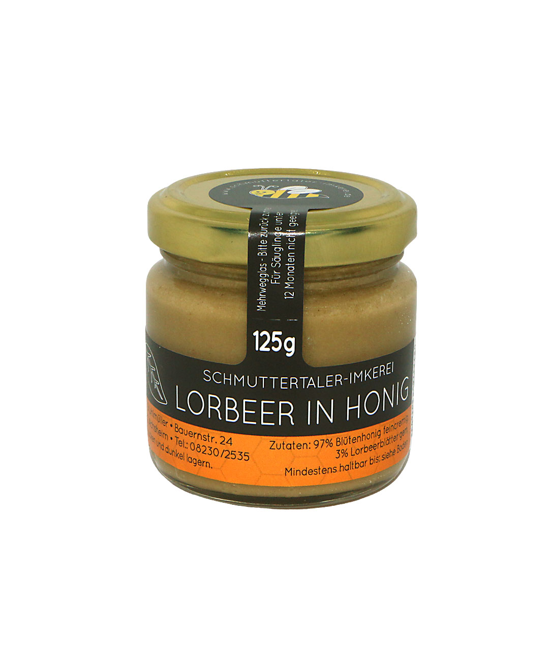 Zutaten: 97 % Blütenhonig feincremig, 3 % gemahlene Lorbeerblätter